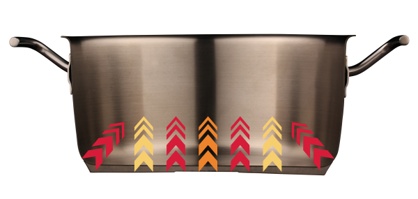 快適性、耐久性、調理性能を考慮して設計されたこのシリーズは、表面にホットスポット(部分的に熱くなること)が発生しないように、底面全体に熱が均一に広がり、優れた保温性をもつインパクトボンディング(高熱高圧接加工)3層構造の底になっています。調理の完全性にくわえて、高い保温性でエネルギーを節約します。