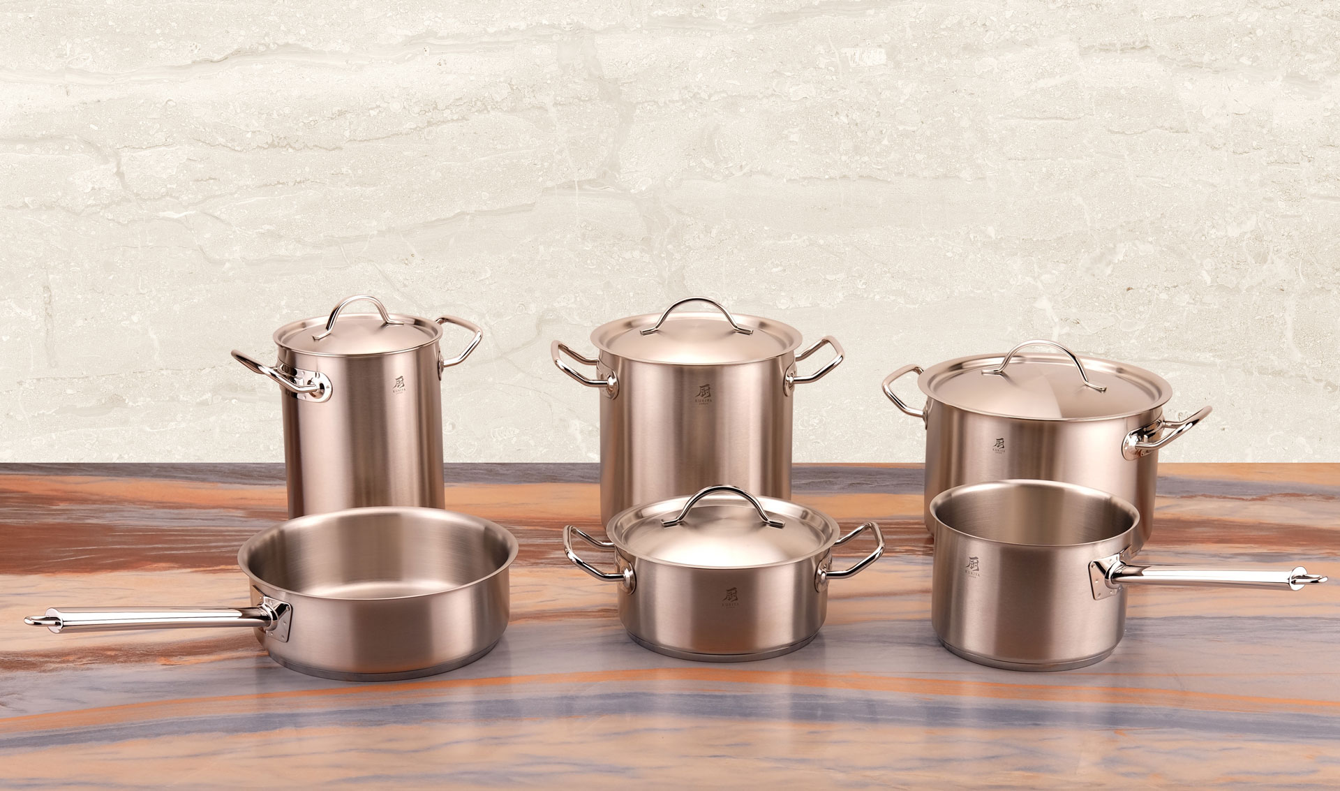快適性、耐久性、調理性能を考慮して設計されたこのシリーズは、表面にホットスポット(部分的に熱くなること)が発生しないように、底面全体に熱が均一に広がり、優れた保温性をもつインパクトボンディング(高熱高圧接加工)3層構造の底になっています。調理の完全性にくわえて、高い保温性でエネルギーを節約します。